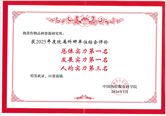 1月29日,热带作物品种资源研究所最新2026年工作会议传来喜讯,在全院2025年研究所综合评价中,品资所取得总体实力和发展实力均第一、人均实力第三的佳绩。