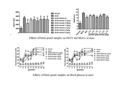 We studied the hypoglycemic activity of bitter gourd germplasm ‘09-18’. Three doses of bitter gourd powder and three doses of extract could significantly reduce blood glucose.
